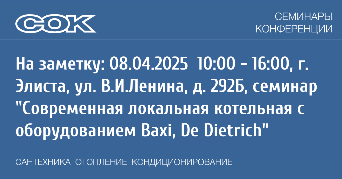Большой технический семинар по тематике «Локальная котельная для коттеджей, коммерческой недвижимости, на оборудовании Baxi, De Dietrich. Правила проектирования и актуальные требования к котельным Способы уменьшения капитальных затрат для локальной котельной. Техническое обслуживание оборудования Baxi, De Dietrich» .