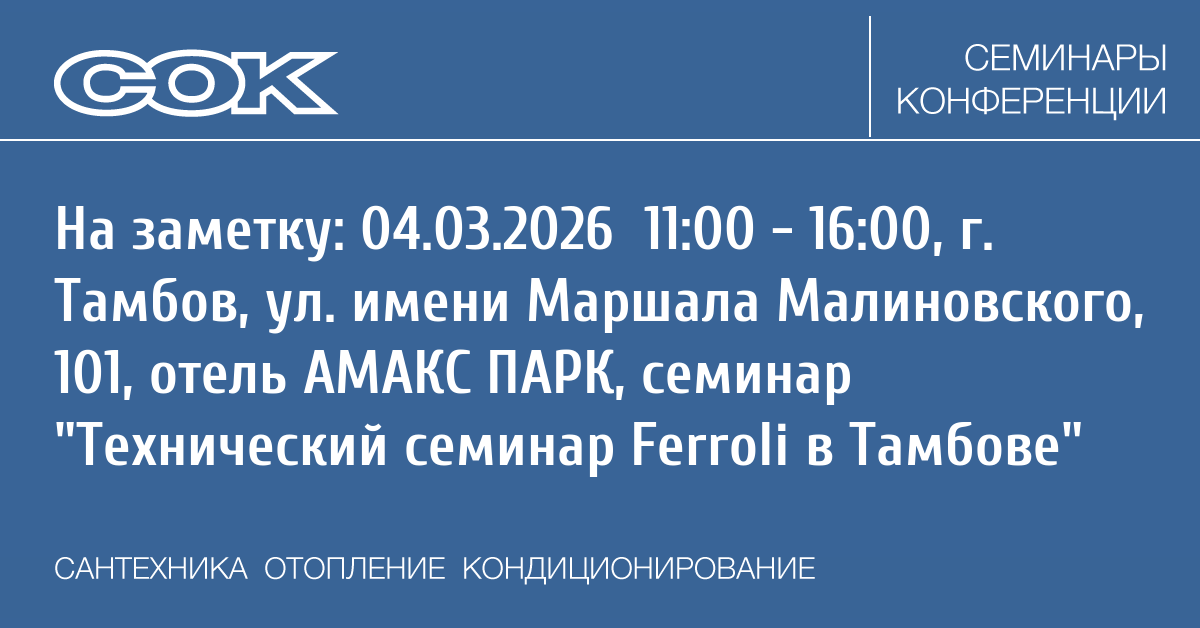 Компания Ferroli проводит технический семинар для монтажников и сервисных организаций в Тамбове.