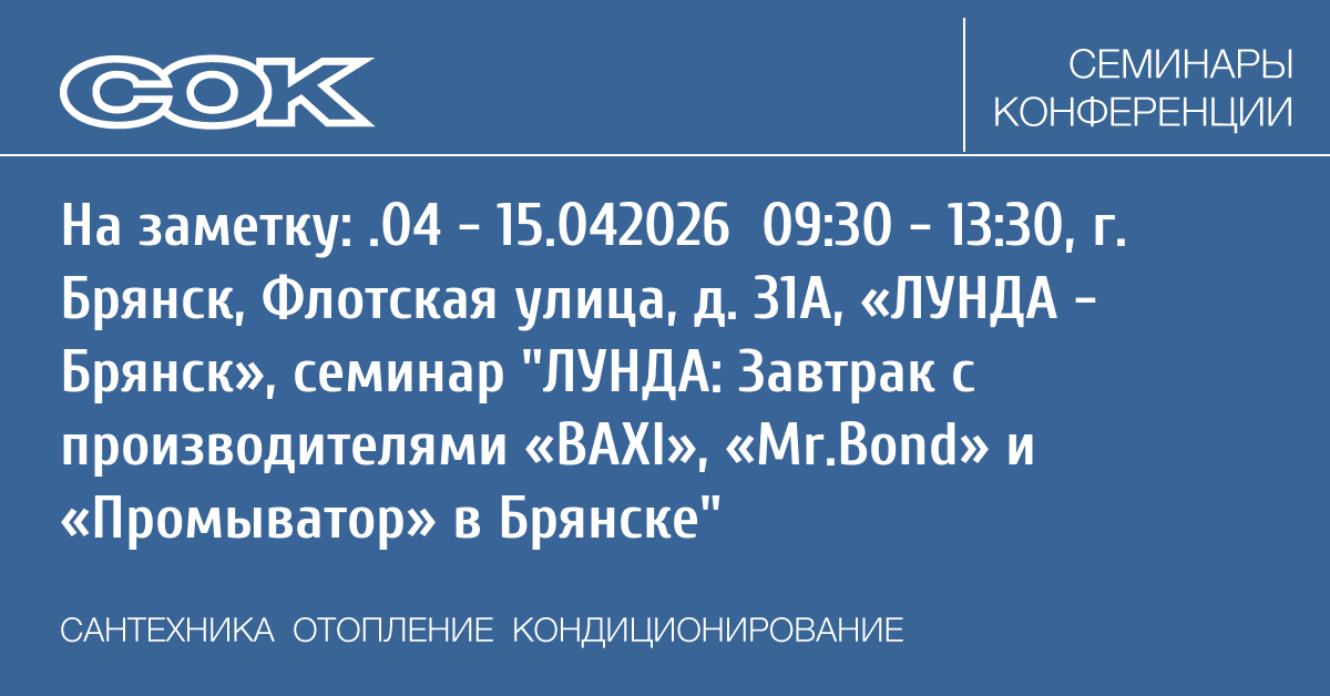 Семинар: ЛУНДА: Завтрак с производителями «BAXI», «Mr.Bond» и «Промыватор» в Брянске