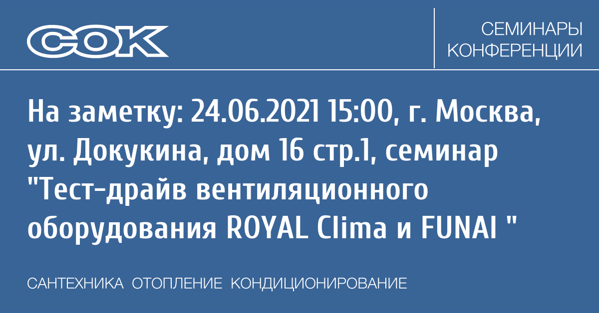 24 июня в 15:00 состоится специальное мероприятие для партнеров ROYAL Clima и FUNAI тест-драйв вентиляционного оборудования
