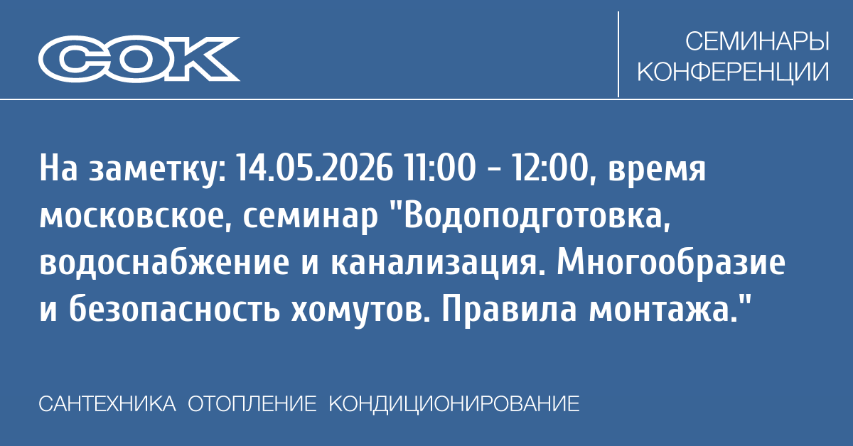 - 11.10–11.50 Водоподготовка, водоснабжение и канализация. Многообразие и безопасность хомутов. Правила монтажа.