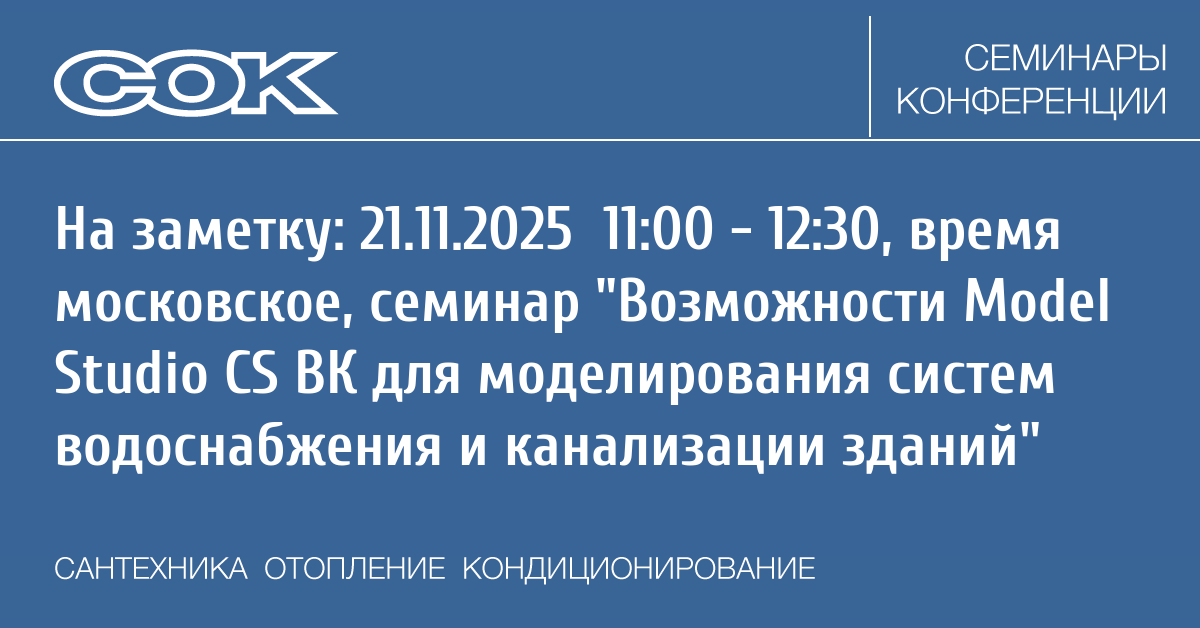 - 21.11.2025 11:00 - 12:30 Webinar Возможности Model Studio CS ВК для моделирования систем водоснабжения и канализации зданий