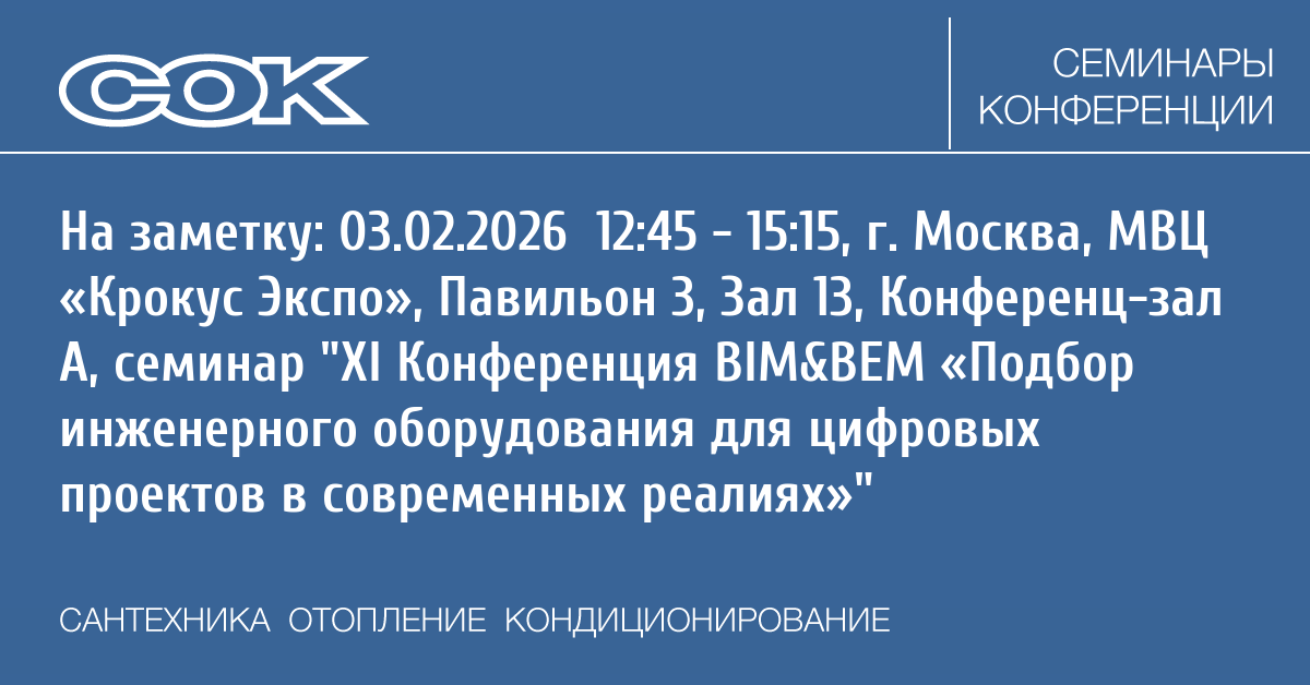 - 03.02.2026 12:45 - 15:15 Конференция XI Конференция BIM&BEM «Подбор инженерного оборудования для цифровых проектов в современных реалиях»